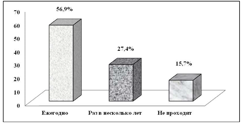 Рис. 1. Распределение респондентов в зависимости от регулярности прохождения ежегодных медосмотров, % Примечание: составлен авторами по результатам исследования