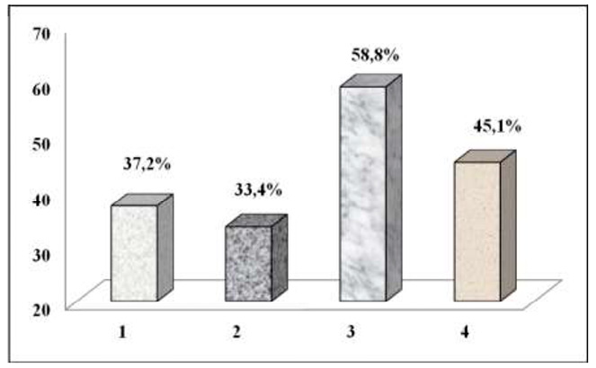 Рис. 2. Частота встречаемости жалоб, % 1 – колебания АД; 2 – учащенное сердцебиение; 3 – головокружение; 4 – боли в груди Примечание: составлен авторами по результатам исследования