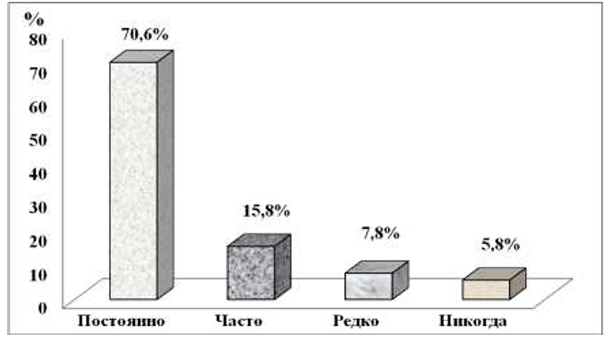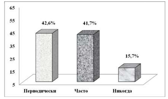 Рис. 3. Распределение респондентов в зависимости от периодичности испытания стресса, % Примечание: составлен авторами по результатам исследования