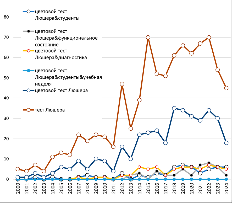 Авторы провели контент-анализ депонированных за 2000–2024 годы научных работ в наукометрической базе данных Российского индекса национального тестирования (РИНЦ) по запросам, отражающим направление исследования: «цветовой тест Люшера & студенты», «цветовой тест Люшера & функциональное состояние», «цветовой тест Люшера & диагностика», «цветовой тест Люшера & студенты & учебная неделя», «цветовой тест Люшера», «тест Люшера» (рис. 1). Из представленного графического анализа видно, что по рассматриваемой авторами теме имеются единичные работы.