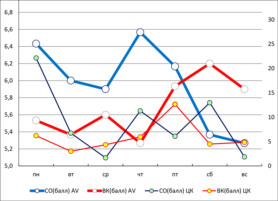 Рис. 2. Динамика изменений СО и ВК: по оси «Х» – день недели, по левой оси «Y» – числовые значения AV, по правой оси «Y» – числовые значения для ЦК Примечание: составлено авторами по результатам данного исследования