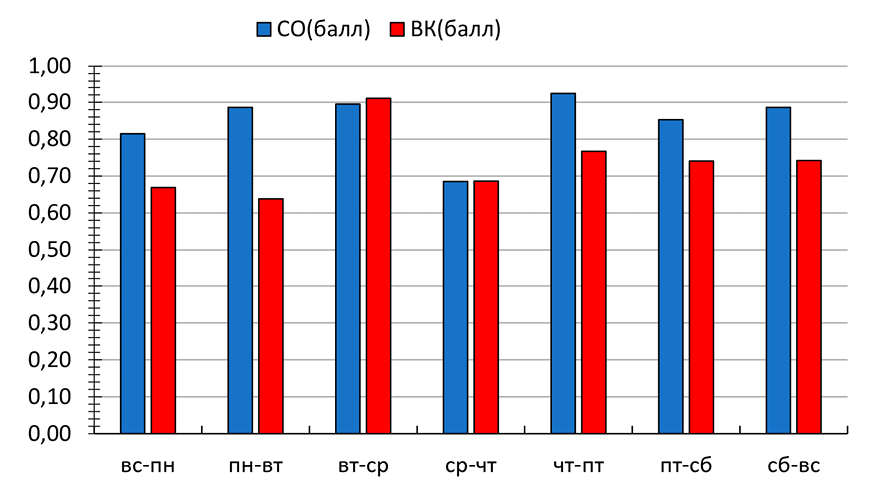 В результате проведенного анализа установлено статистически значимое изменение показателя СО (p < 0,05) между пятницей и субботой, воскресеньем и понедельником.